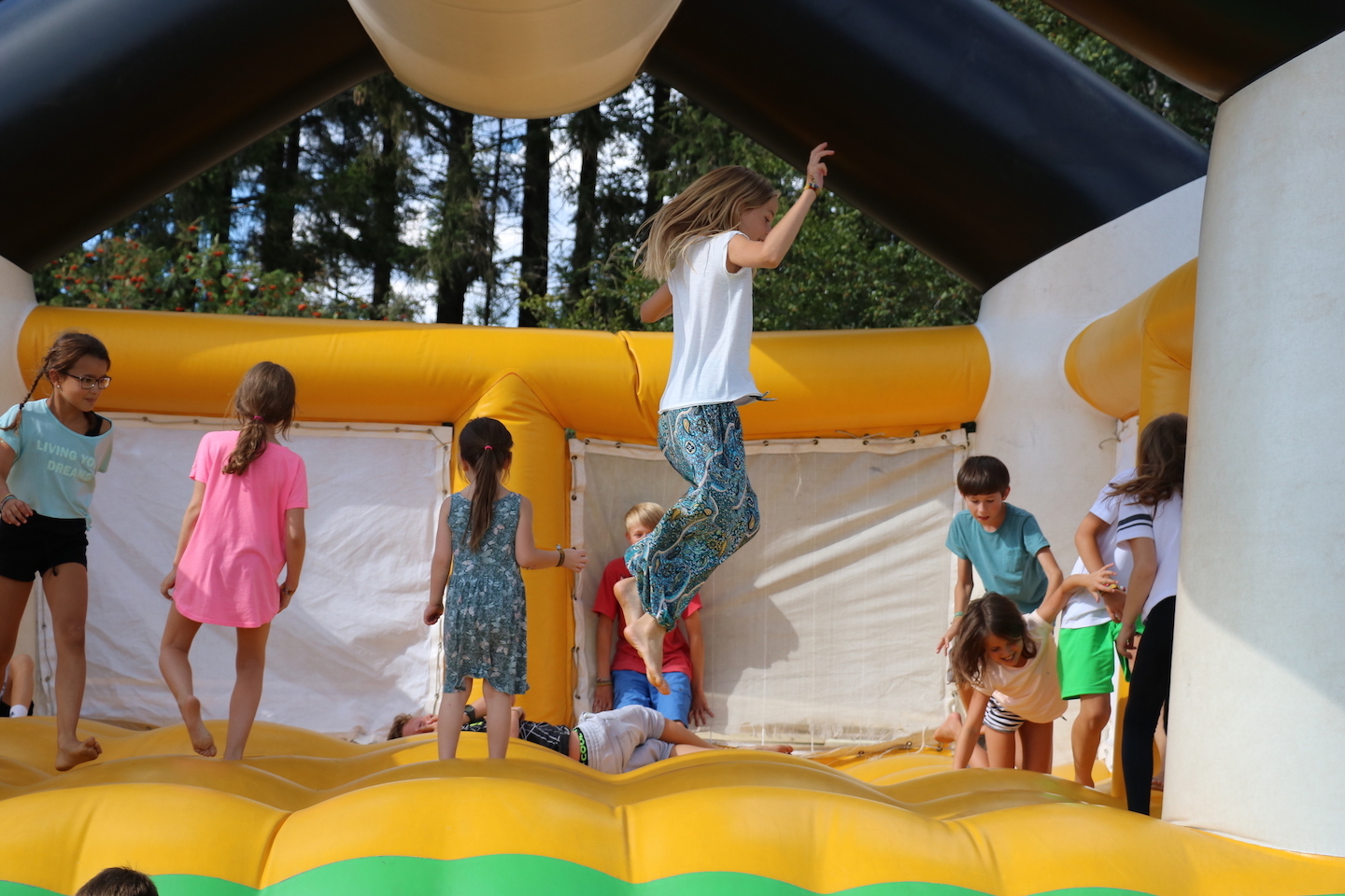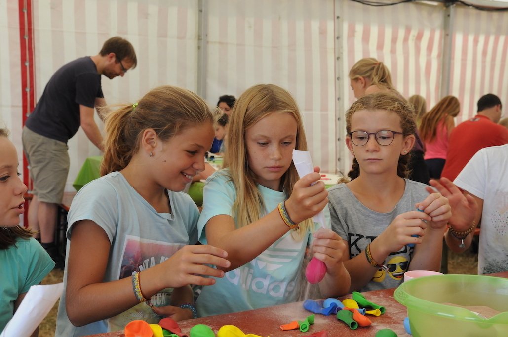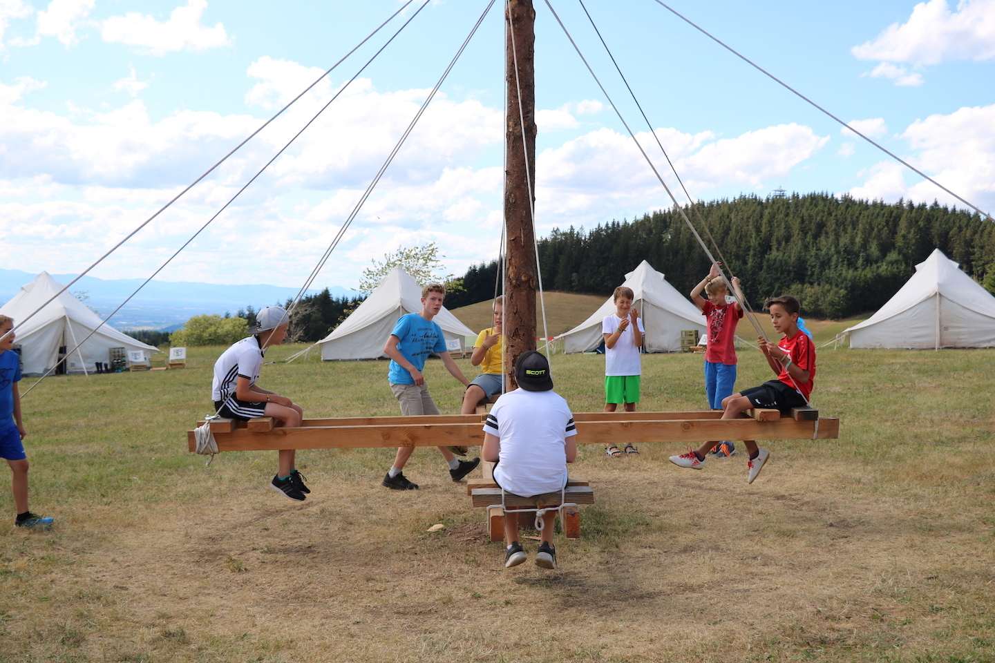 Der heutige Tag stand ganz im Zeichen des Ankommens. Nachdem Sie, die Chauffeure und sonstige Kinder-Transport-Dienstleister, den Platz wieder geräumt hatten, beschäftigten sich alle mit verschiedenen Workshops und Spielmöglichkeiten. So waren Seilbahn, Hüpfburg und Karussell immer gut besucht und es wurde jongliert, gebastelt und getont. Nach einem sättigenden Abendessen (es gab lecker Döner) wurde den Kindern der erste Teil unserer spannenden Abendgeschichte erzählt. Mit Spannung ging es auch bei unserer Nachtwanderung weiter, die uns auf den Hünersedel-Turm geführt hat. Dort konnten die Kinder ihren Mut beim Aufstieg zur Aussichtplattform in 25 Metern Höhe beweisen. Schokopudding und die gemeinsame Zeltzeit waren ein würdiger Abschluss dieses tollen ersten Tages.