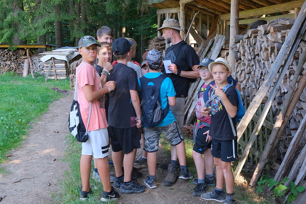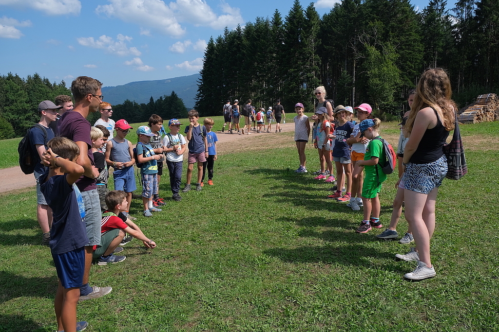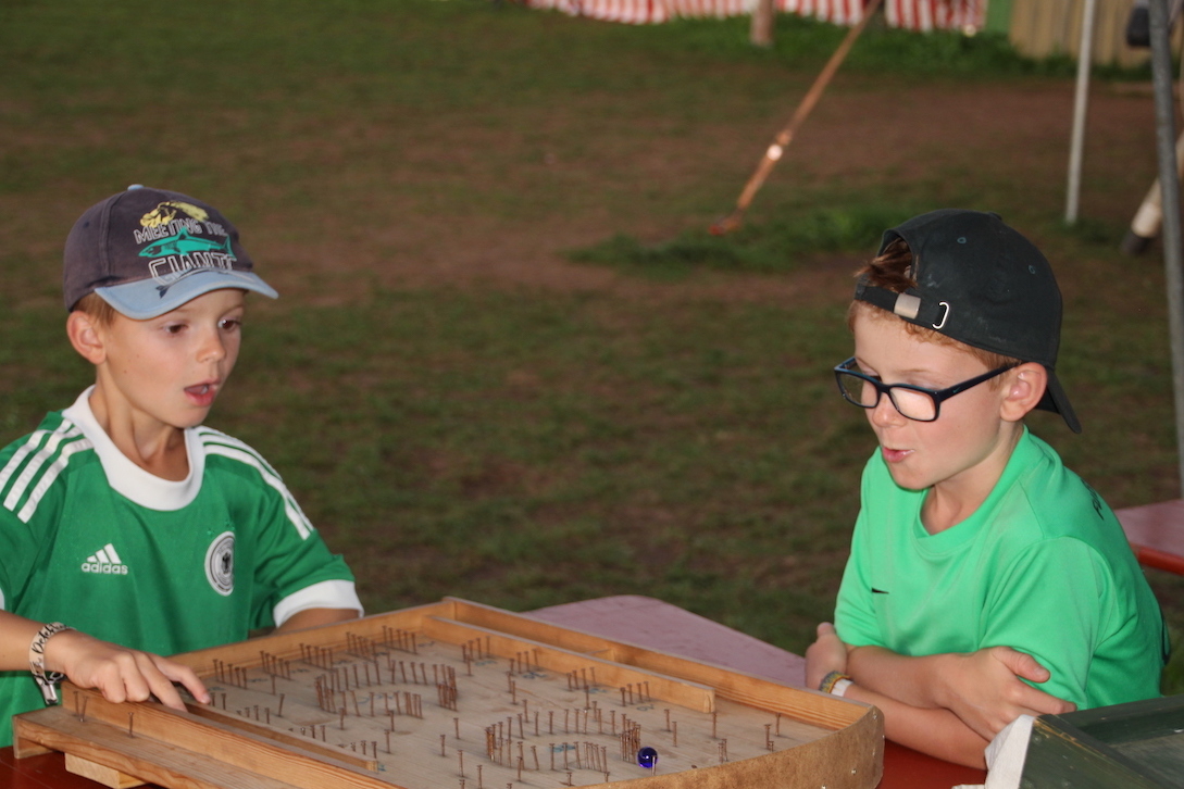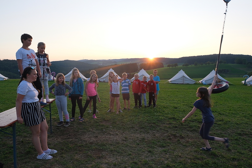 Unter der sengenden, von keiner Wolke getrübten Sonne des heutigen Tages waren wir unterwegs. In Gruppen von zwei bis drei Zelten wurden mit verschiedenen Aufgaben und Rätseln die Detektivfähigkeiten der Kinder getestet. Eine richtungsweisende Aufgabe bestand darin, an jeder Kreuzung den Weg zu erwürfeln (und dann auch wieder zurückzufinden). So ging jede Gruppe ihre eigene, an Lust und Energie angepasste Strecke und knobelte entspannt an unterschiedlichen Rätseln. Unentspannt wurde es nur, wenn sich zwei Gruppen zufällig trafen: Ein packendes Duell, bei dem „Wer bin ich?“ gespielt wurde, brachte die Stimmung oftmals an den Rand der Eskalation (Gott sei Dank wurde niemand ernsthaft verletzt ;-) ).